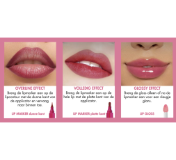 Aan de ene kant een lipmarker voor makkelijke definitie en kleur, aan de andere kant een semi-transparante gloss voor een super glanzend effect.